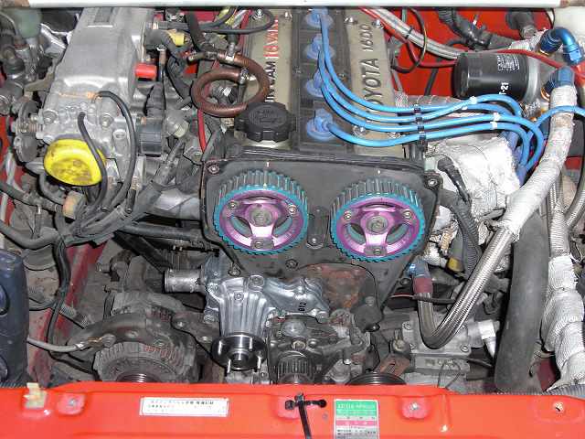 画像はAE86のタイベル&ウオータポンプ交換。HKSのスプロケがなんともかっこいい・・・タイベルも強化タイミングベルトへ交換。