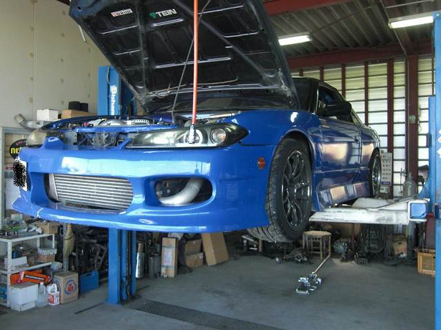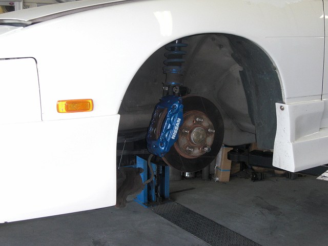 180SXの5穴ハブ化。今回はR32系のロワアームを使って長さを合わせて、ステンメッシュのブレーキホース、4ポットキャリパーを装着。