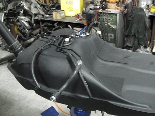 不調の原因は燃料系のだな・・・ポンプでも外れてんじゃ無いかな。と言う事で燃料タンクを下ろしてみると、何と!タンクの内壁が錆だらけ、ポンプがそれを吸ってフィルターがつまって吹けなくなる、ポンプが止まると錆がフィルターから離れて又エンジンは掛かる、と言った具合。ポンプは外れてはいなかったけど・・・