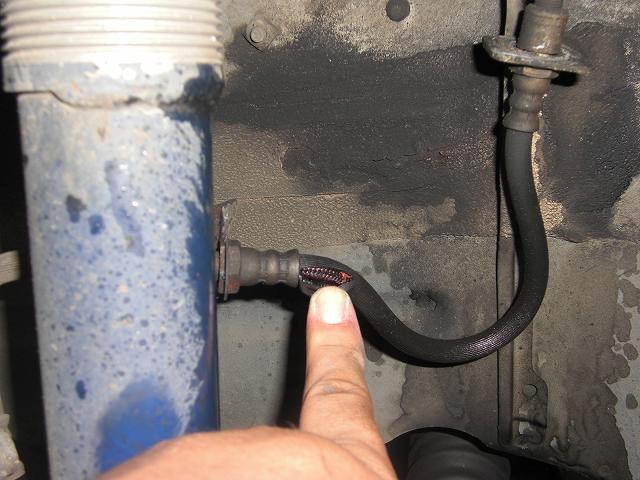 ははぁ〜ん・・・ブレーキホースの破けだな、と思い一箇所づつ点検してみると・・・ビンゴ!!左前のブレーキホースが破裂している!ハチロクに限らず最近シルビア等にもよくあるから・・・よくはない!ウソ言っちゃいかん・・・極たまにあるので皆さんも一度は点検してみよう!
