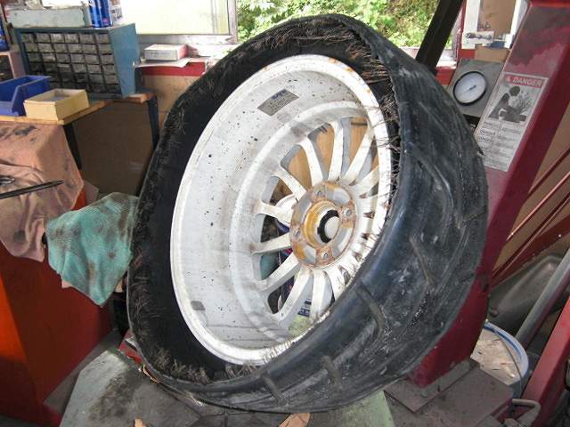 今年の1月と言うと、もう半年前! 富士スピードウェイの本コースで7時間耐久レースに出場した時のバーストしたセミスリ・・・中古の中古の中古タイヤ(かなり古いって事ね)だったからか、凄い事になってるよ。